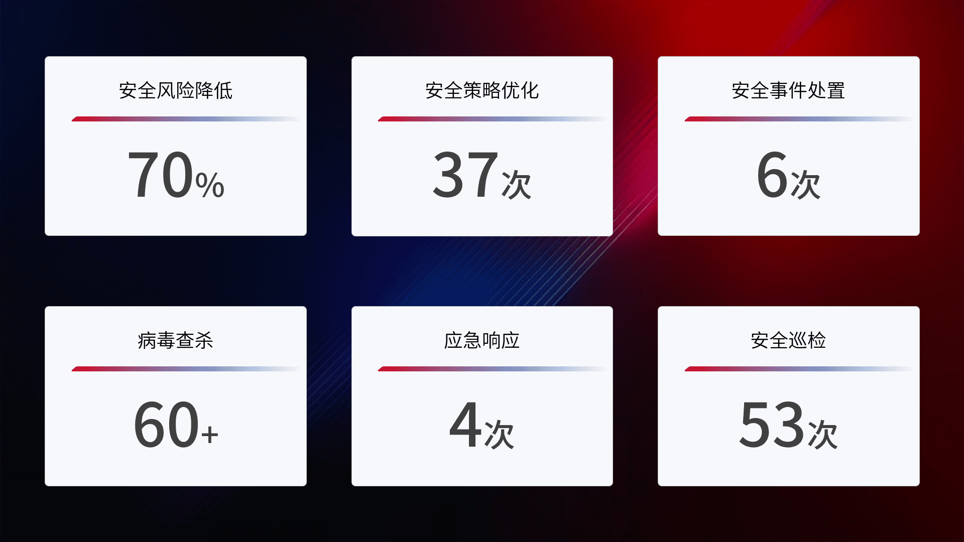 提供全面的安全事件报告体系,,,,包括处置报告、、周报、、、季度和年度总结,,,结合持续监控,,,,帮助客户深入了解网络安全状况。。
