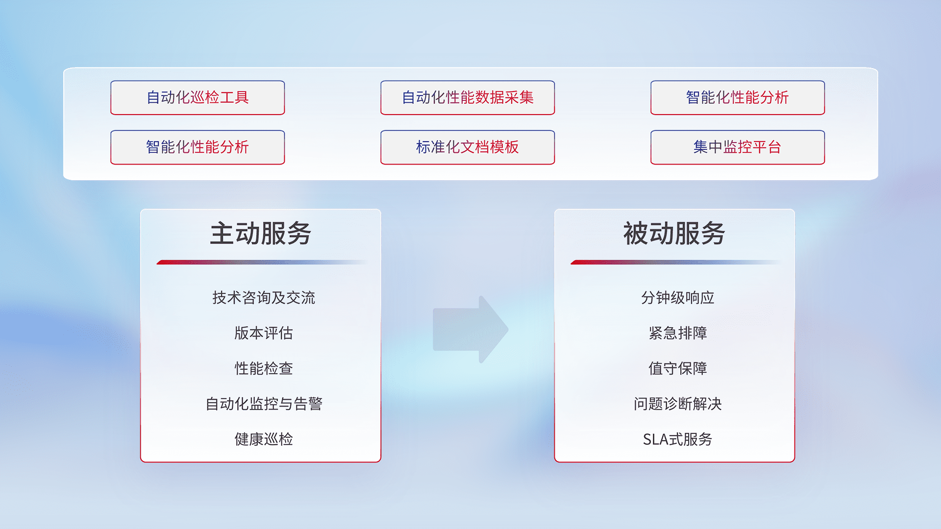 智能化工具和标准化文档,,,保障服务质量,,,提供主动服务(包含技术咨询、、、、版本评估、、、性能检查、、、、自动化监控与告警、、、健康巡检)和被动服务包含(分钟级响应、、紧急排障、、、值守保障、、问题诊断解决、、、、SLA服务)。。